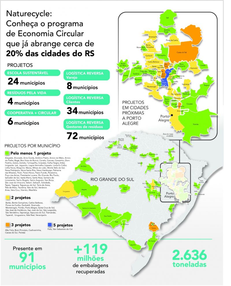 Também parte do Naturecycle, a iniciativa Resíduos pela Vida estimula moradores a destinarem seus resíduos em pontos de coleta espalhados por 18 locais, em quatro municípios, para que os recursos sejam revertidos para sete entidades diferentes. Já o Cooperativa + Circular, que conta com seis cooperativas participantes em seis municípios, capacita essas entidades para que se tornem negócios sustentáveis e gera créditos de reciclagem às cooperativas, com o objetivo de contribuir no desenvolvimento estrutural delas. O ecossistema circular também envolve a logística reversa com clientes em 34 municípios, com gestores de resíduos em 72 municípios e, no setor de varejo, 11 estabelecimentos em oito municípios.