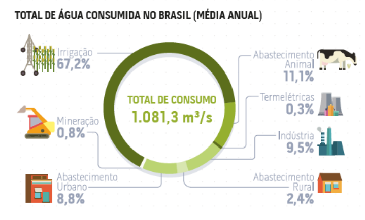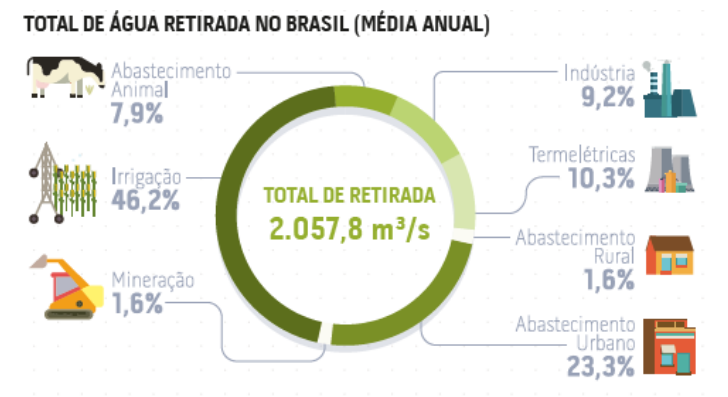 Se para muita gente água é recurso escasso, não se pode dizer o mesmo da disponibilidade dela para os produtos agrícolas. No Brasil, são retirados de mananciais pouco mais de 2 mil litros de água por segundo, e 46% ocorre pelas atividades de irrigação no campo. O abastecimento urbano fica com 23,2% e o rural com apenas 1,6%. Veja abaixo no gráfico da ANA: