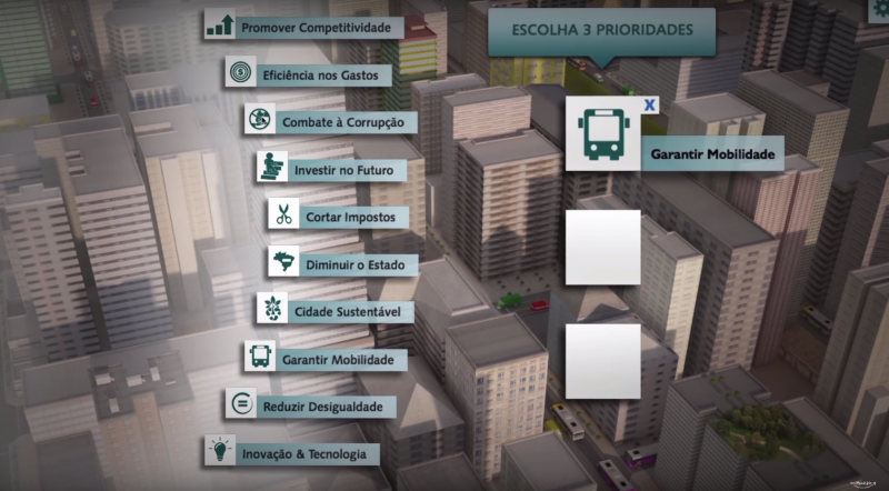 Agora, um novo jogo surge utilizando o planejamento urbano como temática principal, e com a educação como enfoque principal: o Cidade em Jogo, criado pela Fundação Brava e pelo Brazil Institute do Woodrow Wilson Center, coloca o jogador no papel do prefeito de uma cidade (que pode ter porte e perfil econômico variados) face aos principais desafios encarados por eles: que áreas priorizar em sua administração? Qual a melhor política pública para lidar com determinado problema? E como agir diante dos impactos das suas ações na opinião pública?