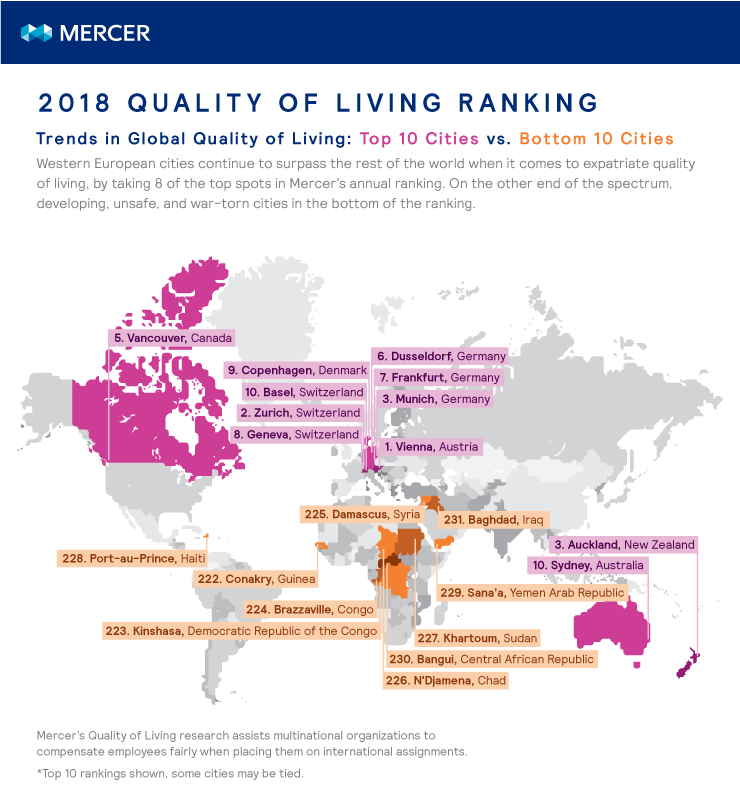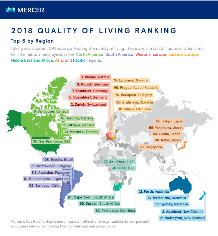 Pela nona vez consecutiva no ranking que chega em 2018 à sua 20ª edição, a capital da Áustria, Viena, foi a cidade com os melhores indicadores observados. Os principais fatores positivos identificados na cidade, fundada como uma ocupação ainda na época do Império Romano, foram um alto nível de segurança, transporte público bem estruturado e uma grande variedade de atrações culturais e de recreação, segundo a Mercer.
